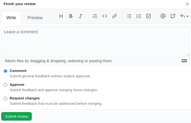 request changesand include a summary of the observation(s), as well as any practice(s) you find them to be in conflict with, in the review body (Fig 3).If you don't feel comfortable giving approval or requesting changes but want to share a summary or observations of larger patterns in the codebase or the company, select "Comment" and submit your review.