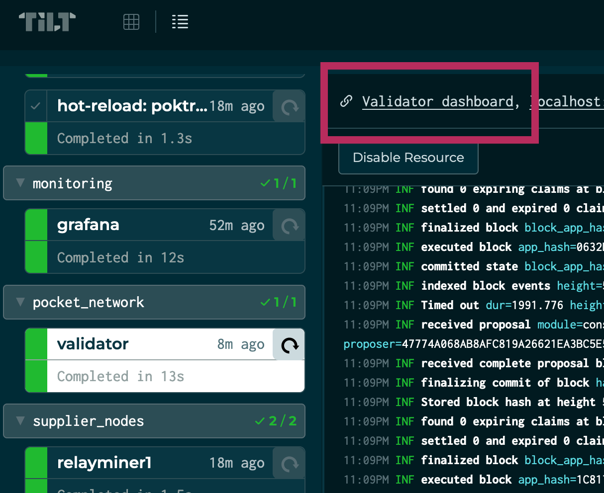 Each service in Tilt has a link to its own Grafana dashboard (RelayMiner, Validator, PATH Gateway, etc).