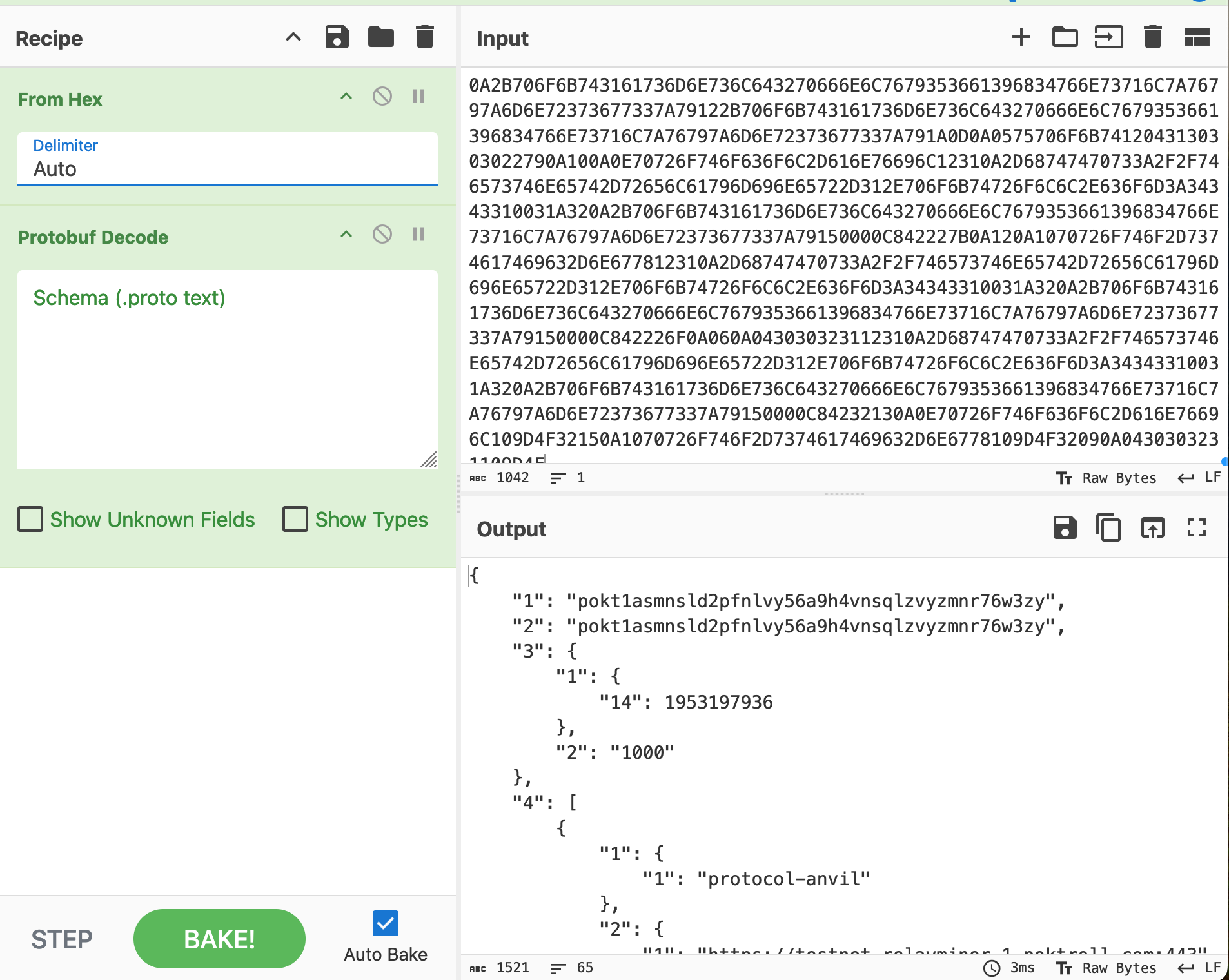 Apply the "From Hex" operation followed by "Protobuf Decode" to reveal the human-readable content.