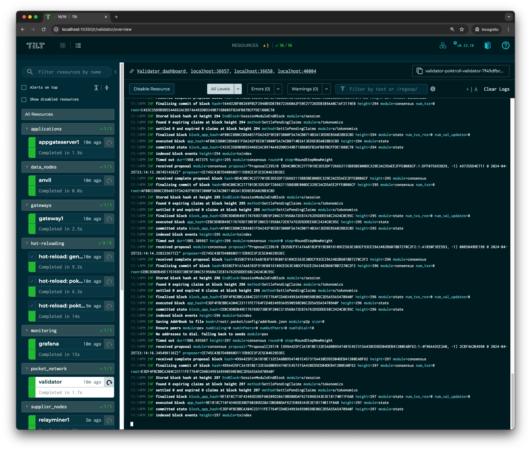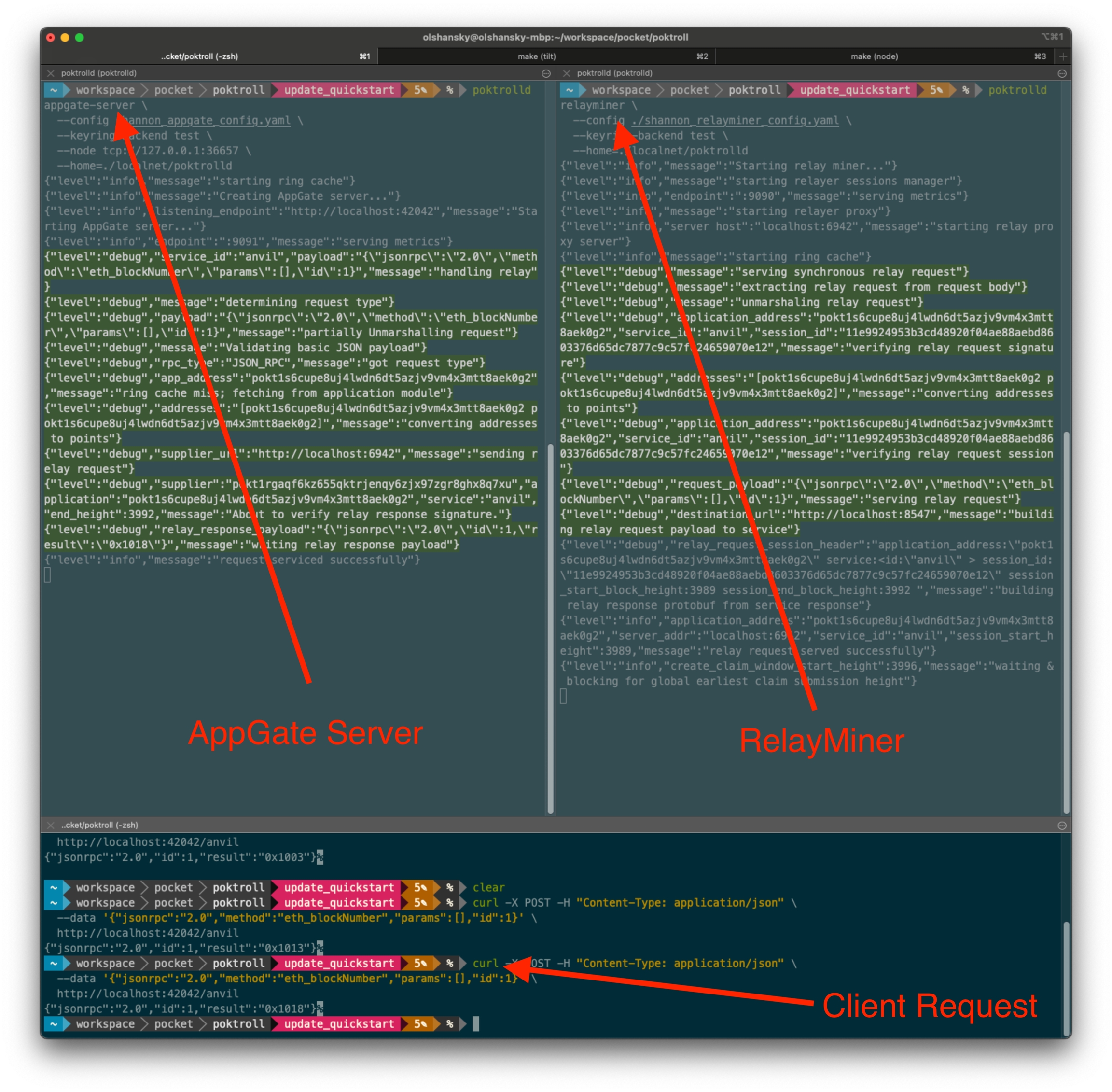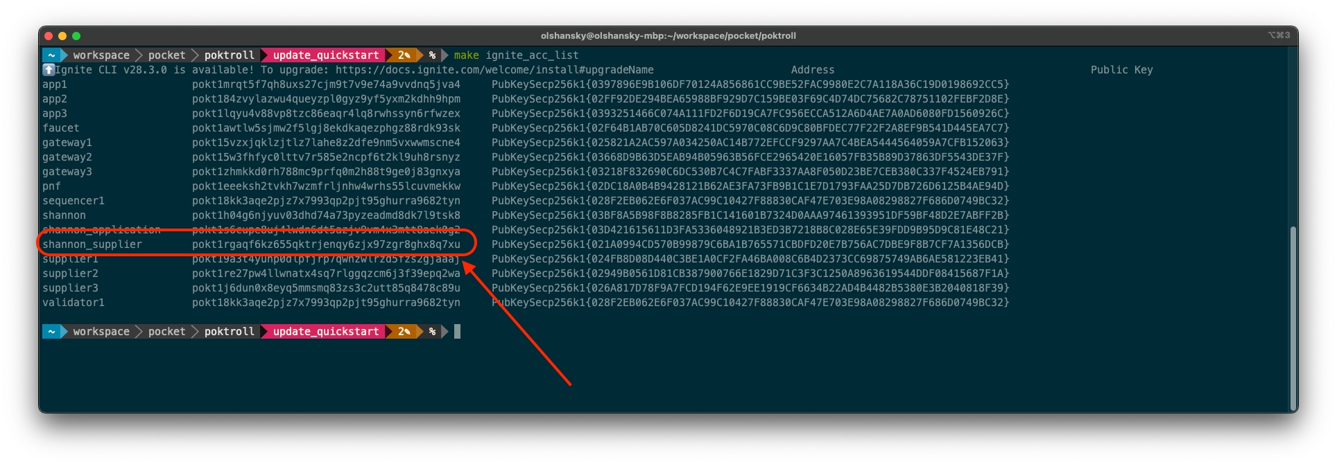 --home=./localnet/pocketdLeave it running. Re-export SHANNON_APPLICATION and SHANNON_SUPPLIER in new shells if needed.