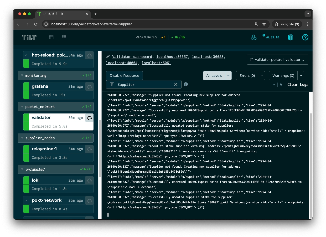 Use Tilt or Grafana to inspect logs. Filter for "Supplier" in Grafana or Tilt.