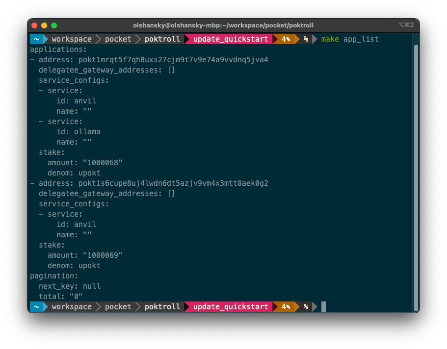 pocketd query application show-application $SHANNON_APPLICATION --network=localYou can also run make app_list to see the application listed.