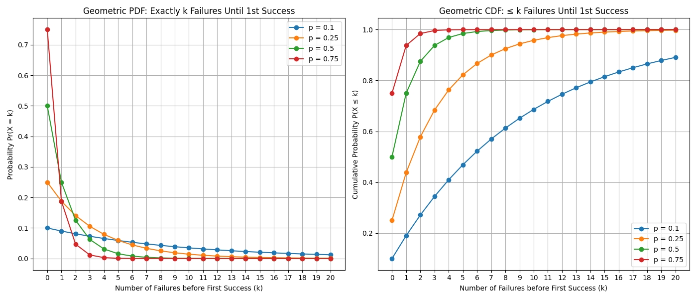 In practice, we often care about Pr(X ≤ k) — the probability of k or fewer failures before success — which is represented by the Geometric CDF. For simplification and clearer proof, the document uses the expected value from the Geometric PDF, which guarantees results at least as secure compared to directly using the CDF.
